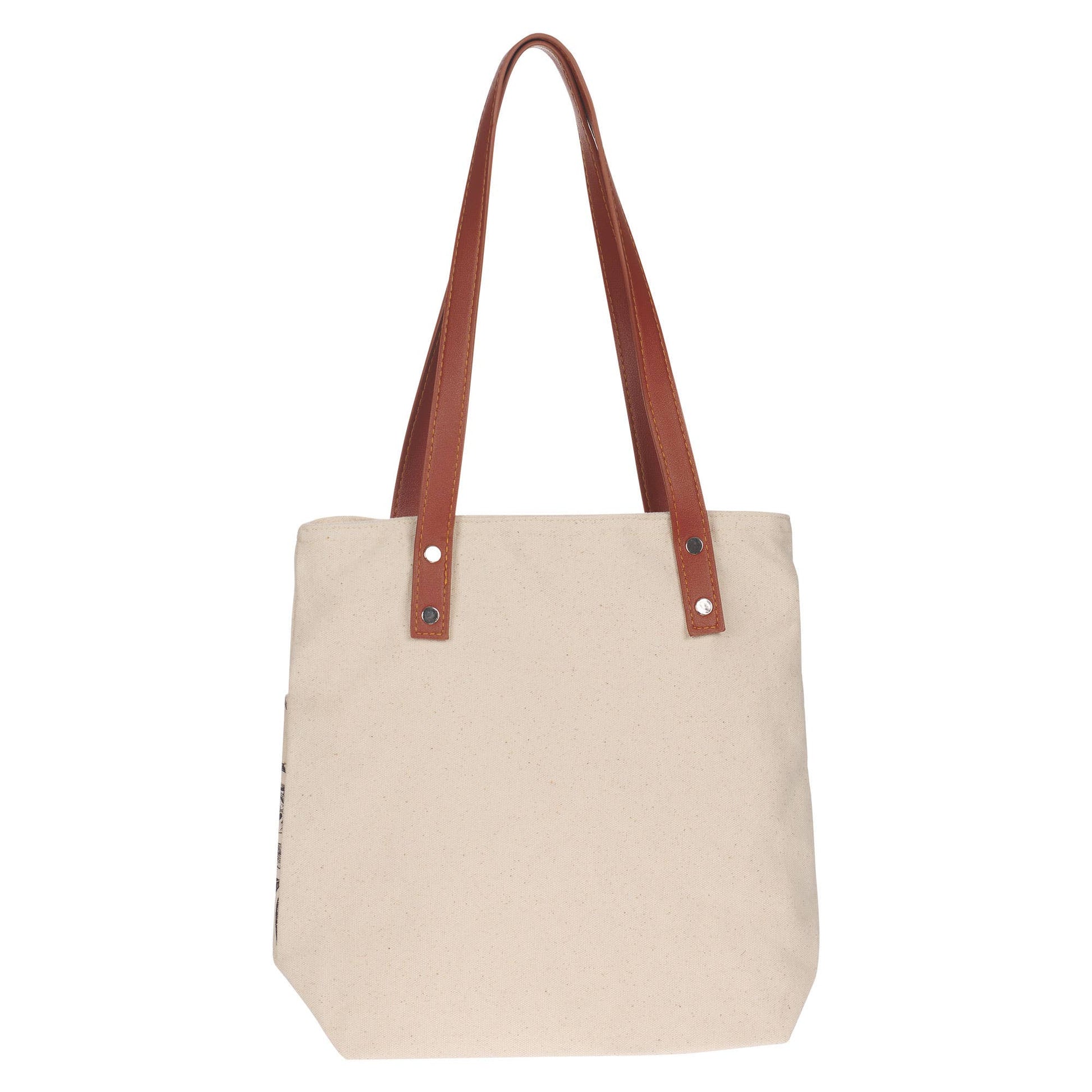 Screen-printed natural canvas exterior, Screen-printed text, Amazing Grace, 2 Corinthians 12:9, Lined interior, Canvas tote, Tawny brown faux leather handles, Brushed gold hardware, Back slip pocket, Spot clean, Size: 11.5" x 11" x 3.5" (292 x 279 x 89mm)