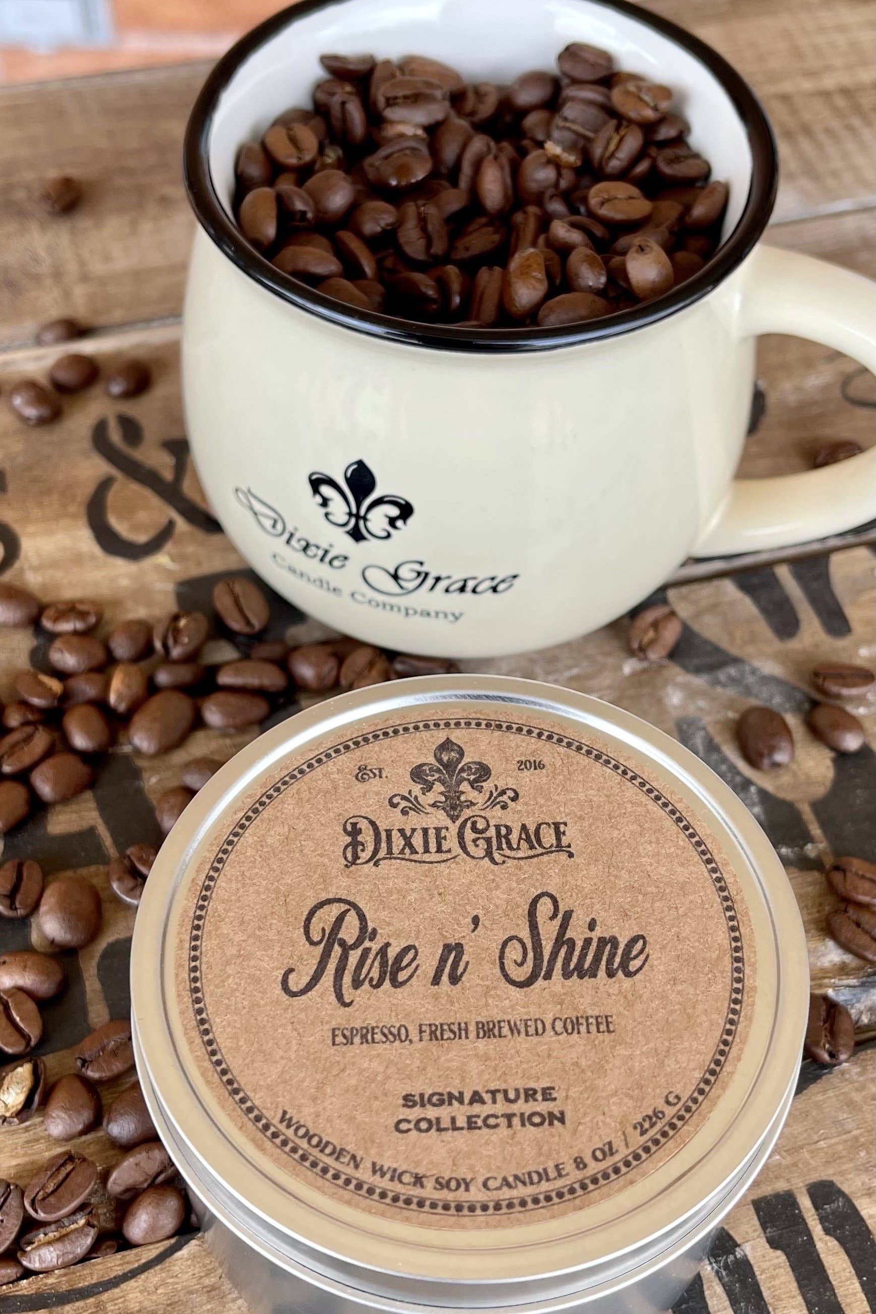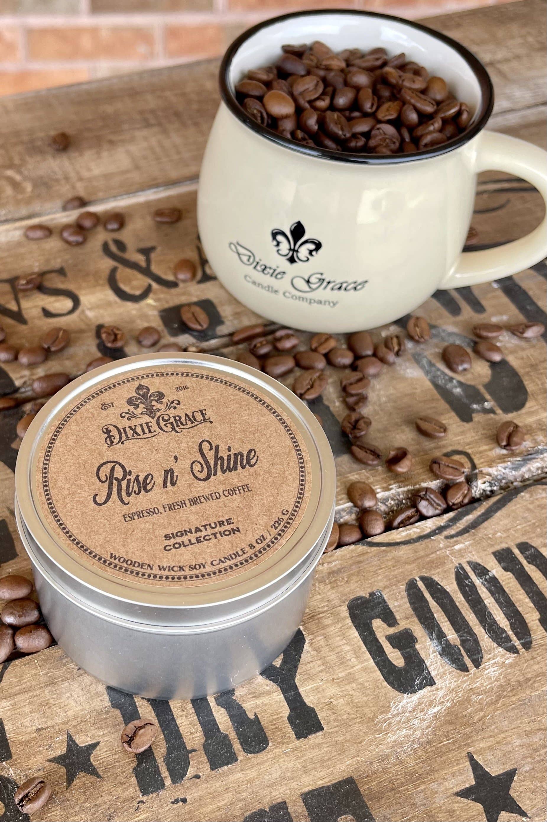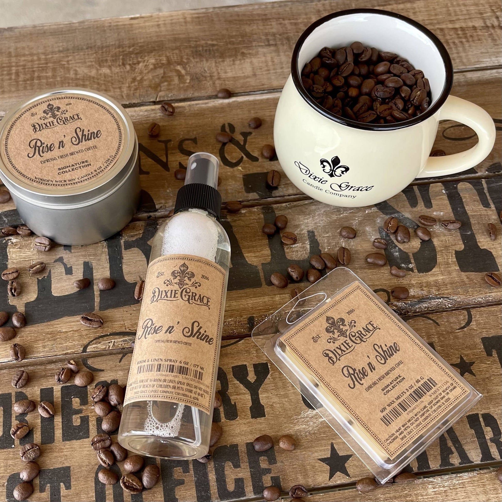 Rise 'n Shine One of my fondest memories growing up was the smell of my Daddy's coffee brewing at 4 am in the morning before he went to work. Deep, Rich Espresso and Fresh Brewed Coffee blend into our Signature Scent founded on that memory.