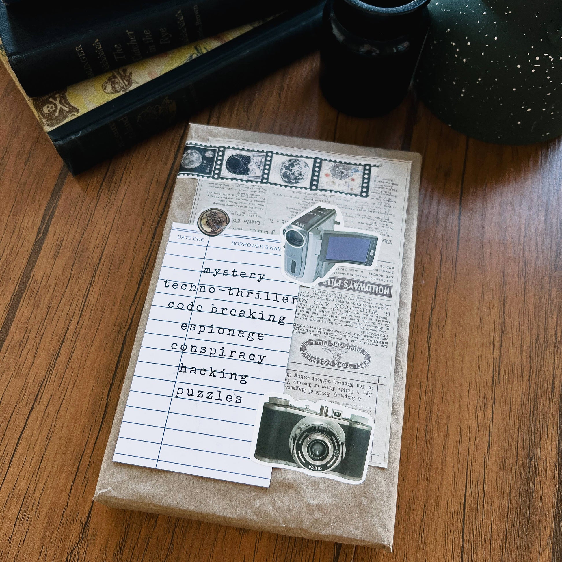 The Whimsy Collection features our whimsical scrapbook-style design, adorned with ephemera, paper, and stickers. Each book is accompanied by a 'library card' on the front, featuring a list of intriguing keyword hints for the reader in a vintage typewriter font.