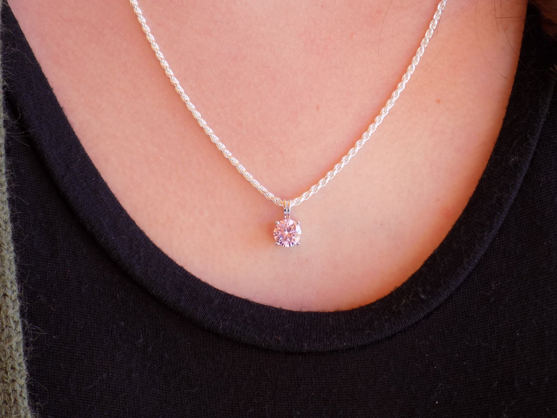 Pendant: Sterling Silver with pink cubic zirconia with around cut and a 1.3ct in a prong setting, high polished, 925 sterling silver. (4.4mm)