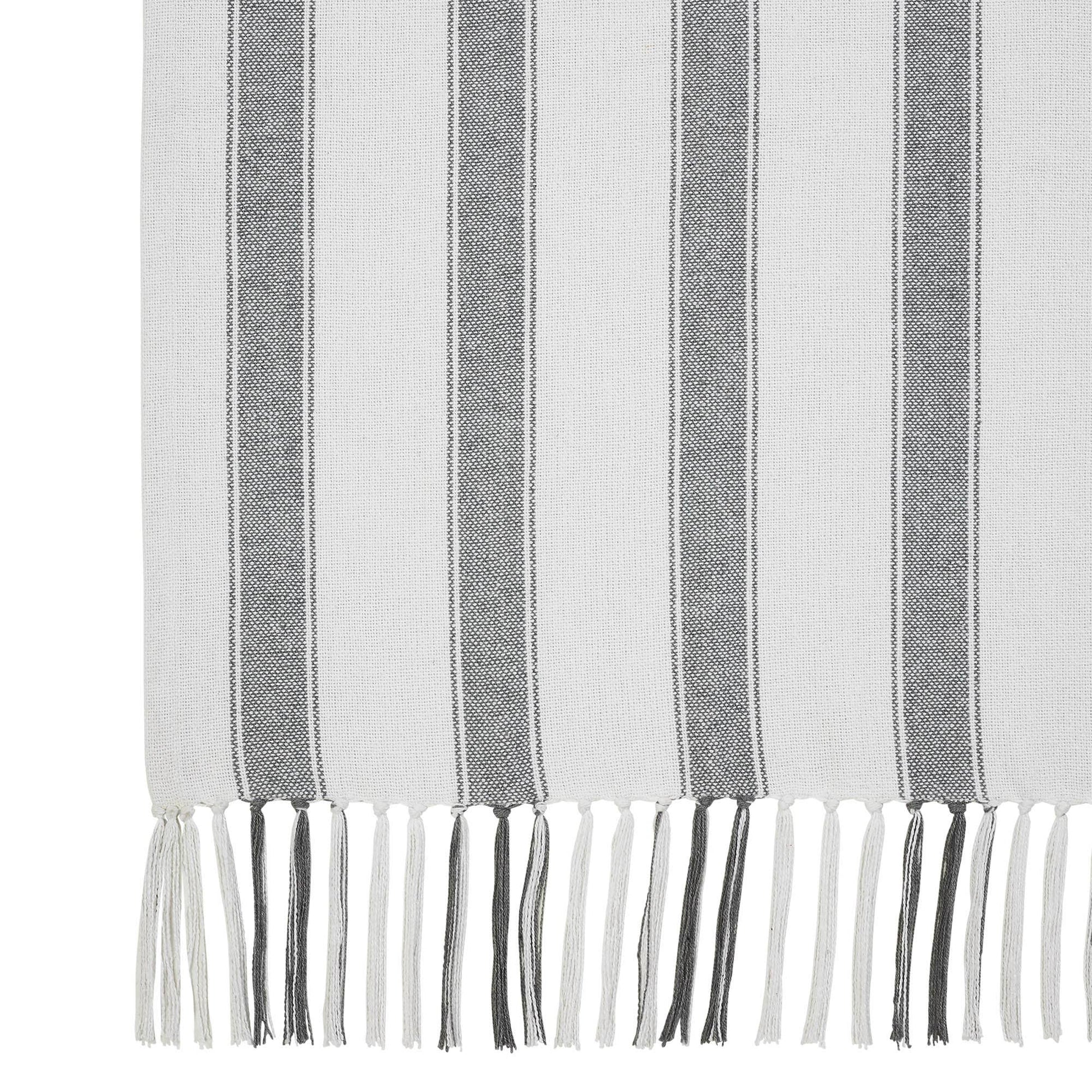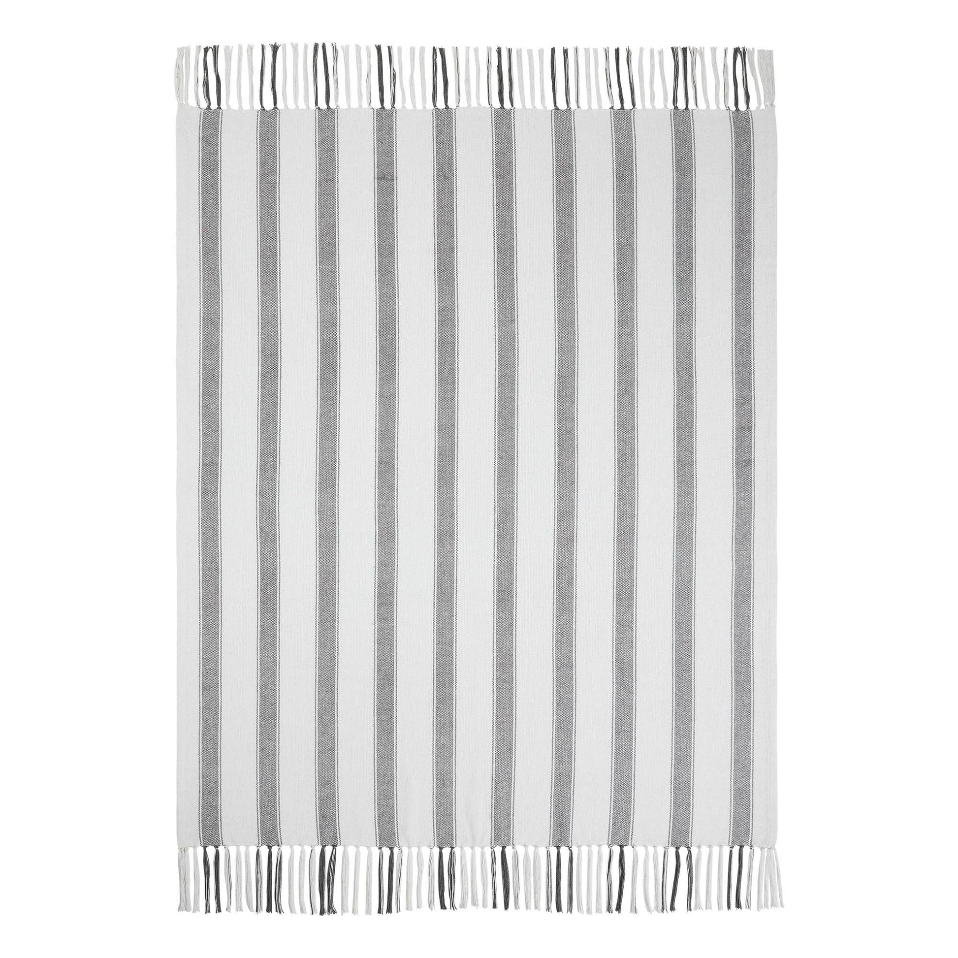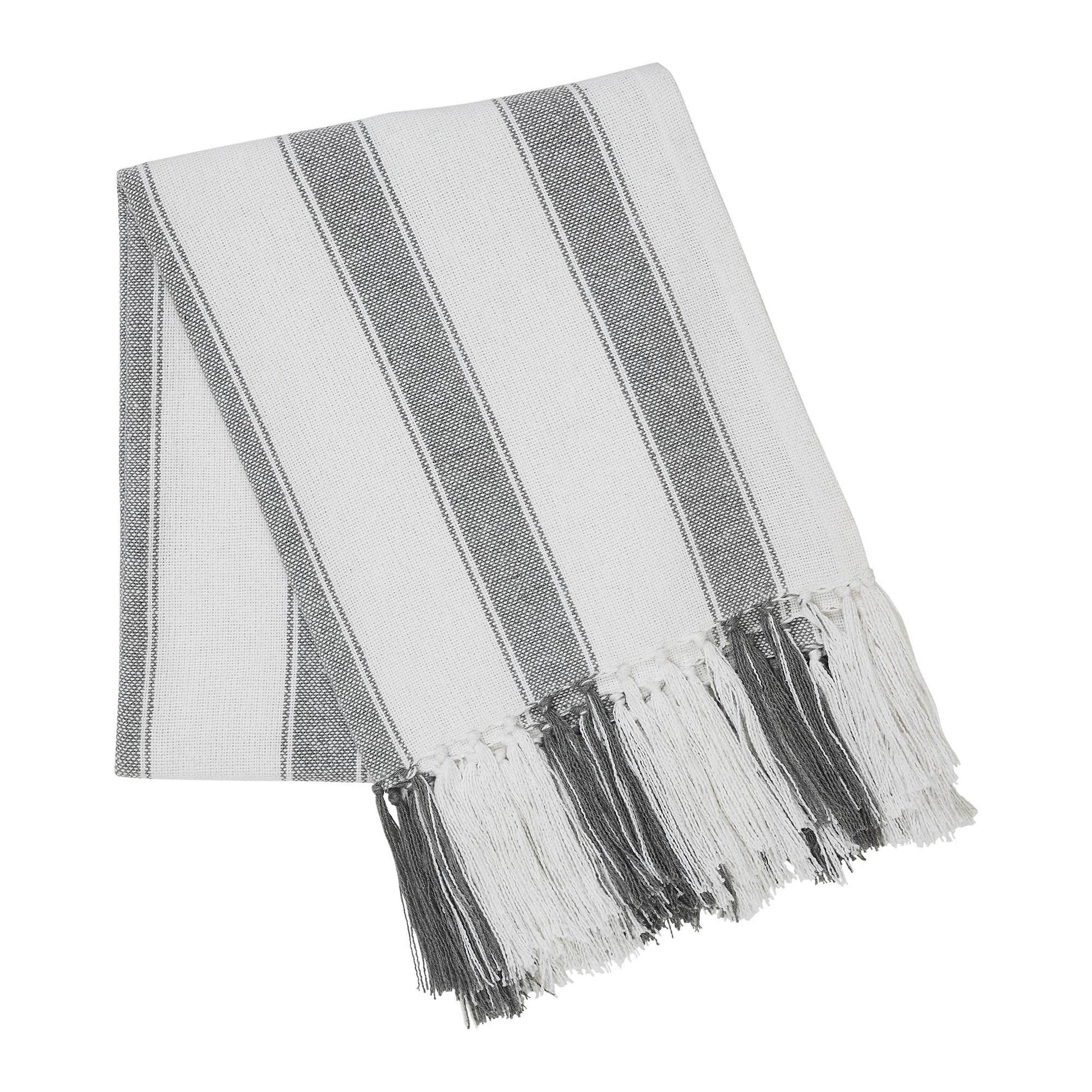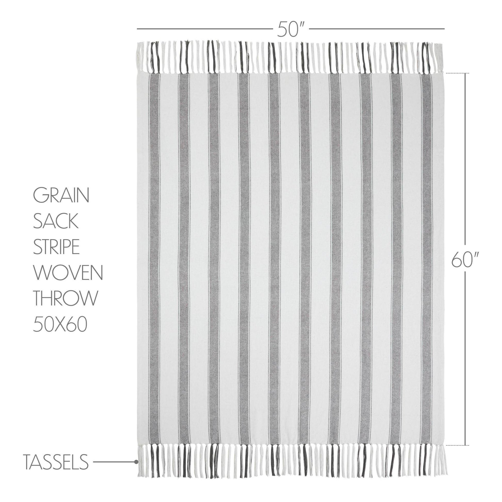 Transform your home into a cozy vintage farmhouse with timeless grain sack stripes. The Grace Grain Sack Stripe Woven Throw measures 50x60 inches. The classic country throw blanket features a soft creme base with nickel gray stripes. Tasseled edging adds an extra pop of texture.